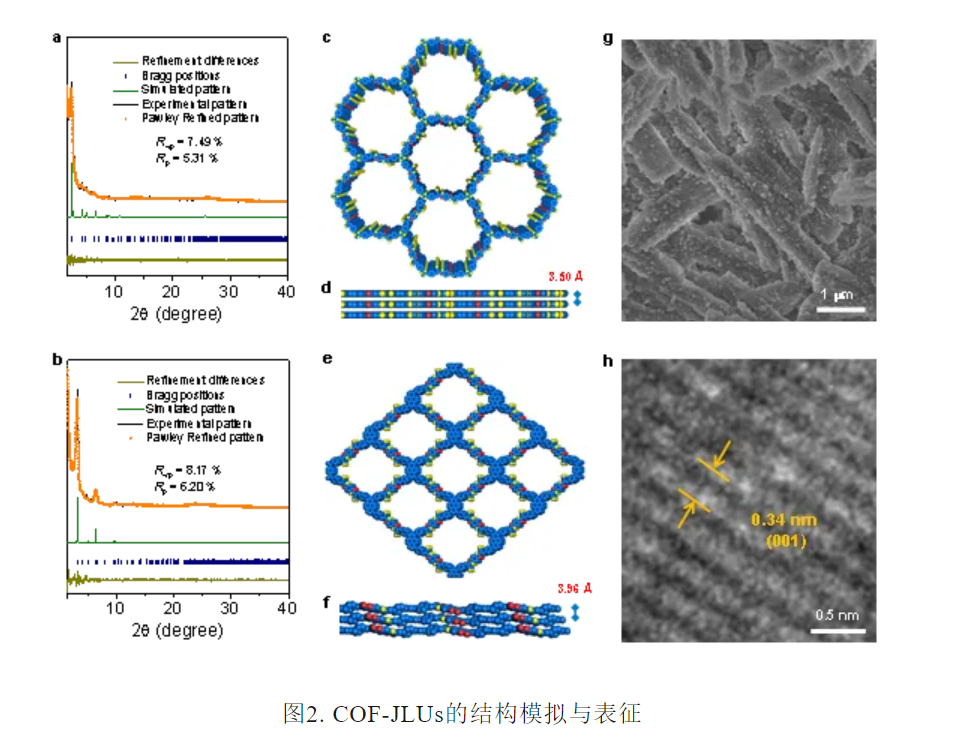 研究团队采用梯度升温策略,通过Knoevenagel缩聚反应,以BBX-2CN为连接单元,分别与三嗪(TFPT)和芘(TFPPy)单体缩合,成功制备了两种新型COFs。其中,COF-JLU44呈现六方晶系结构(空间群P6/M),而COF-JLU45为四方晶系(C2/m空间群)。通过粉末X射线衍射(PXRD)分析,COF-JLU45的(110)晶面衍射峰半高宽仅为0.34°,显著优于已报道的sp²碳连接COFs,表明其高度有序的结晶性。高分辨透射电镜(HR-TEM)进一步显示COF-JLU45具有清晰的0.34 nm晶格条纹,对应(001)晶面,证实了层间π-π堆叠的有序性。