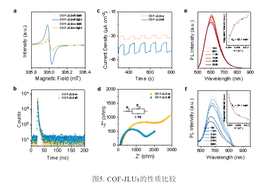 通过时间分辨荧光光谱(TRPL)分析,COF-JLU45的激子平均寿命达2.26 ns,远超COF-JLU44的1.66 ns,表明其电荷复合速率更低。电化学阻抗谱(EIS)显示,COF-JLU45的电荷传输阻力小于COF-JLU44,印证了其更高效的载流子迁移能力。此外,瞬态光电流测试显示,COF-JLU45的阴极光电流密度为6.7 μA cm-2,是COF-JLU44的2.68倍,直观反映了其优异的电荷分离动力学。此外,其激子结合能低至24.1 meV,接近环境热能(26 meV),使得激子可自发解离为自由电荷,极大提升了电荷利用率