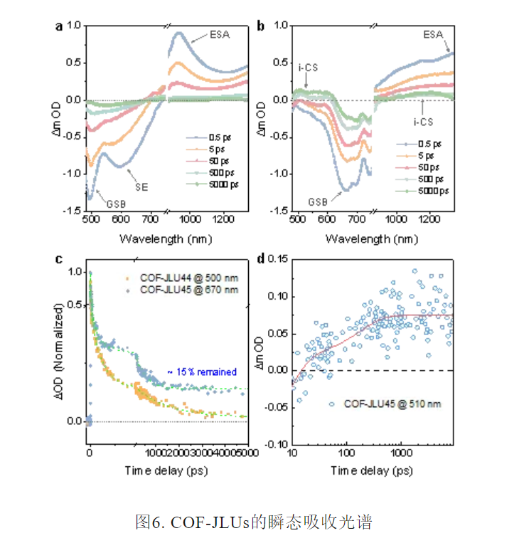瞬态吸收光谱(TA)分析为揭示COF-JLU44与COF-JLU45的电荷分离机制提供了关键证据(图6)。在400 nm激光激发下,COF-JLU44的TA谱图显示两个漂白峰(GSB:~500 nm,SE:~610 nm)及宽范围的光诱导吸收(PIA:~930 nm),对应激子的生成与衰减过程。GSB和SE信号在5000 ps内迅速衰减至基线(图6a),表明其激子寿命较短(平均1.66 ns),且未检测到电荷分离态(i-CS)的生成。这种快速复合行为源于COF-JLU44的三嗪-苯并双恶唑结构中电子-空穴重叠积分较高(S=0.74,图7a),导致激子结合能(Eb=32.7 meV)较大,电荷难以有效解离。