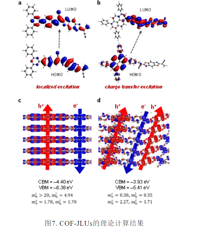 相比之下,COF-JLU45的TA动力学展现出显著差异(图6b-d)。激发初期(0.5 ps),其GSB信号位于~670 nm,伴随ESA信号在1350 nm处出现,表明激子的瞬时生成。随着时间延迟,ESA信号逐渐红移至1150 nm,并在510 nm处形成新的吸收峰(图6d),这一动态变化揭示了电荷分离态(i-CS)的逐步形成。值得注意的是,约15%的GSB信号在5000 ps后仍持续存在(图6c),表明COF-JLU45中存在长寿命的自由电荷载流子,其生成寿命经多指数拟合为105 ps(图6d)。这种高效的电荷分离归因于其供体-受体结构:芘单元作为电子供体,苯并双恶唑-氰基链段作为受体,形成跨骨架的电荷转移态(电子-空穴分离距离达9.57 Å,S=0.34),显著降低了激子结合能(Eb=24.1 meV)。理论计算进一步表明(图7b),COF-JLU45的面内电子与空穴有效质量分别为0.38 和0.35 ,载流子迁移阻力极低,使得分离后的电荷可沿共轭骨架快速传输至反应位点。