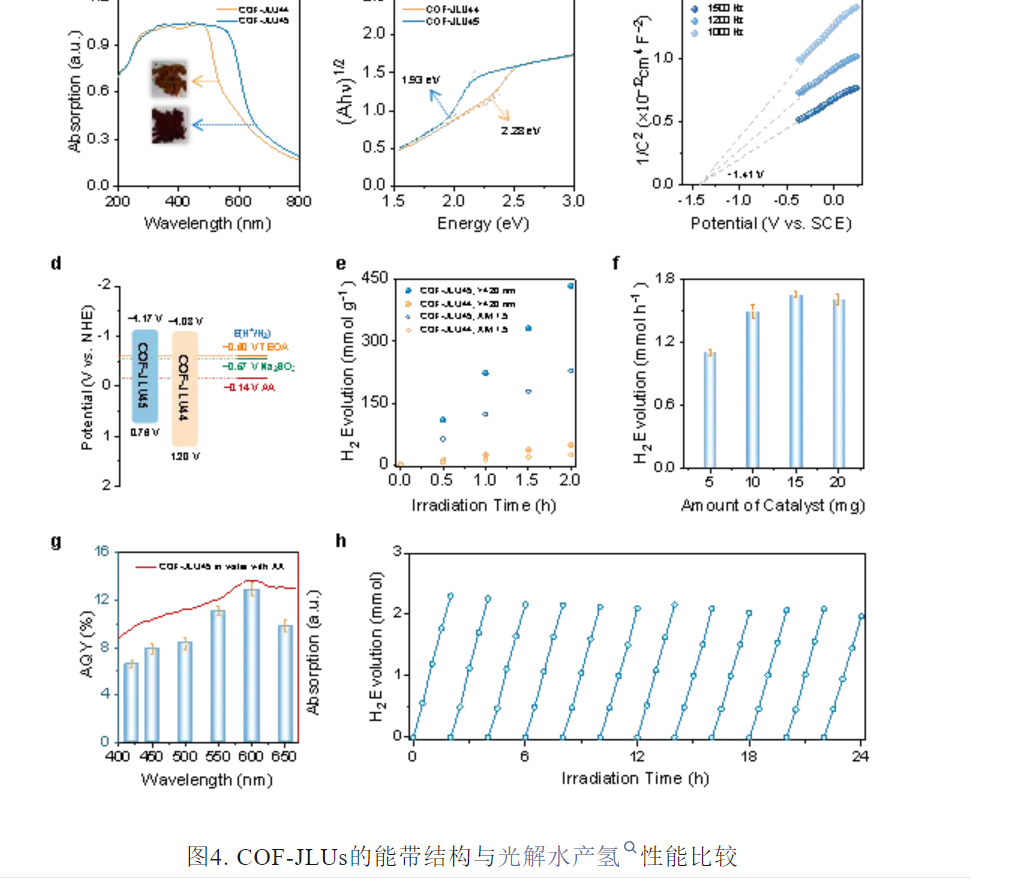 紫外-可见漫反射光谱(UV-Vis DRS)显示,COF-JLU45的光吸收边延伸至680 nm,覆盖可见光至近红外区域,其光学带隙通过Tauc曲线计算为1.93 eV,显著低于COF-JLU44的2.28 eV。这种宽光谱响应源于芘单元的强供电子能力与苯并双恶唑的吸电子效应协同作用,形成供体-受体(D-A)结构,拓宽了π共轭体系。通过Mott-Schottky测试计算导带电位(CBM)发现,COF-JLU45的CBM为-1.17 V vs. NHE,远低于质子还原的平衡电位(-0.41 V vs. NHE),表明其具备强质子还原能力。