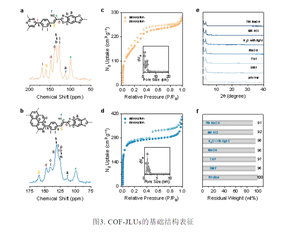 氮气吸附-脱附测试表明,COF-JLU45的BET比表面积达860 m2 g⁻1,高于同类材料(如V-COF-2的627 m2 g⁻1),且孔径分布集中于1.9 nm,与理论模型高度吻合。固体核磁(13C CP-MAS)与XPS谱图证实了氰基乙烯键的形成,在~159.5 ppm处观察到新生成的乙烯碳信号。红外光谱表明醛基特征峰(~2712.8 cm⁻1)显著减弱,表明单体成功聚合。稳定性测试结果证实了COF-JLU45具有优异的酸碱和光解稳定性。