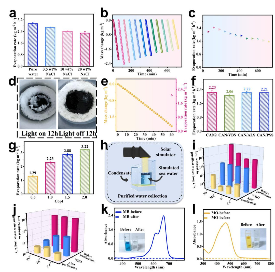 图5:(a)不同浓度盐水中的蒸发速率。(b)CAN2的质量损失在连续12 h光照时。(c)CAN2的蒸发速率在连续12 h光照时。(d)光照12h后和关灯12h后的蒸发器表面图片。(e)蒸发速率和质量损失在关灯12h后继续进行的蒸发实验。(f)CAN2,CAN/VBS,CAN/SAF,CAN/PSS的蒸发速率。(g)CAN2的蒸发速率在不同光照强度时。(h)蒸发水收集装置。(i)离子浓度的改变在净水前后。(j)重金属离子浓度的改变在净水前后。(k)亚甲基蓝浓度的改变在净水前后。(l)甲基橙浓度的改变在净水前后。