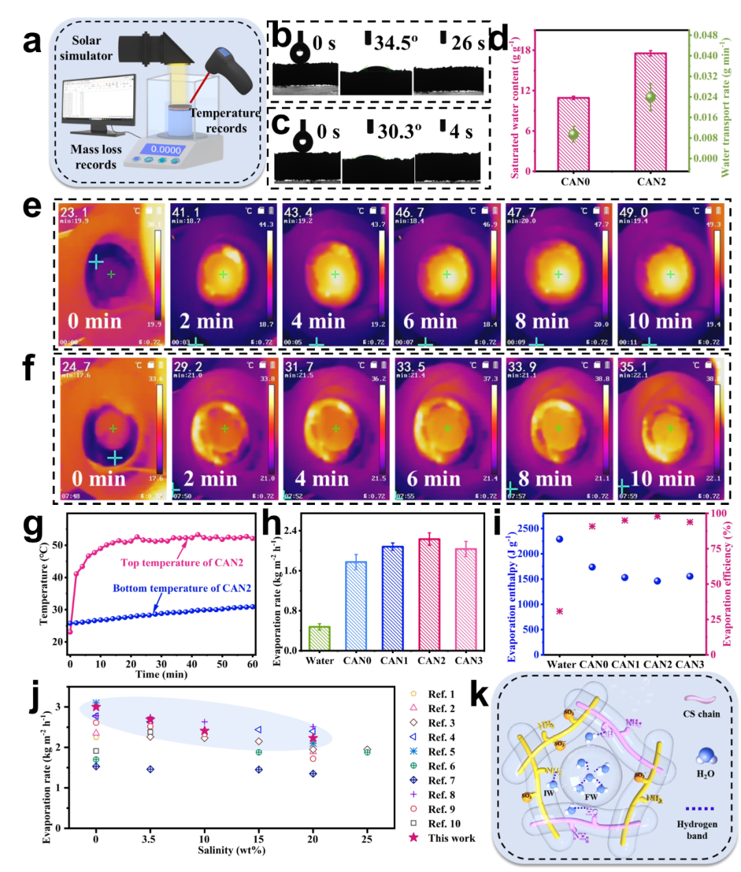 图4:(a)室内蒸发实验装置图。水凝胶的水接触角图:(b-c)CAN0和CAN2。(d)CAN0和CAN2的饱和水含量和水运输速率。(e)CAN2的红外图片(f) 未添加Ti3C2Tx的CAN2 的红外图片。(g)CAN2的顶层和底层温度。(h)蒸发速率。(i)蒸发焓和蒸发效率。(j)不同盐度时的蒸发速率在以前所作的工作中。(k)蒸发焓降低的原理。