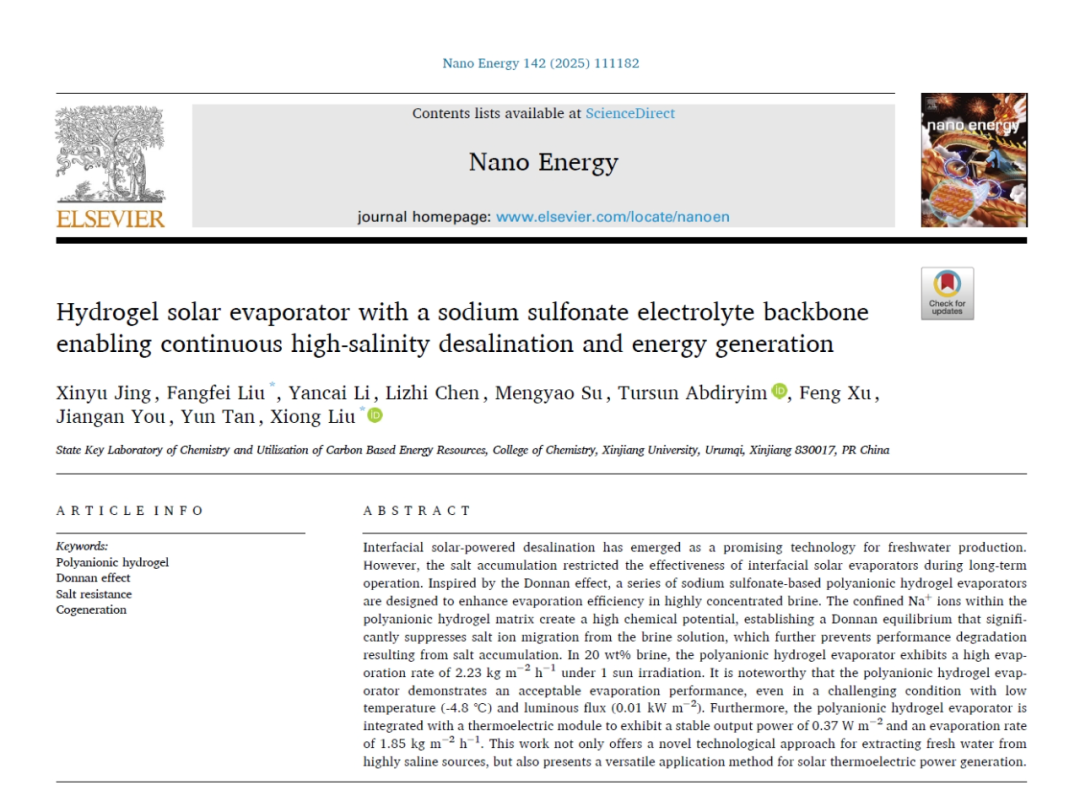 此外,将水凝胶与热电模块进行组装,该装置展示出稳定的输出功率0.37 W m-2和1.85kg m-2 h-1的蒸发速率在1太阳光照下。这项工作不仅为高浓度盐水中淡水的获取提供了新颖的技术手段,同时还为太阳能热电发电提供了灵活应用方法。相关研究成果以“Hydrogel solar evaporator with a sodium sulfonate electrolyte backbone enabling continuous high-salinity desalination and energy generation”为题在《Nano Energy》期刊上发表。刘雄副教授为该论文的通讯作者,荆鑫瑜为该论文的第一作者。