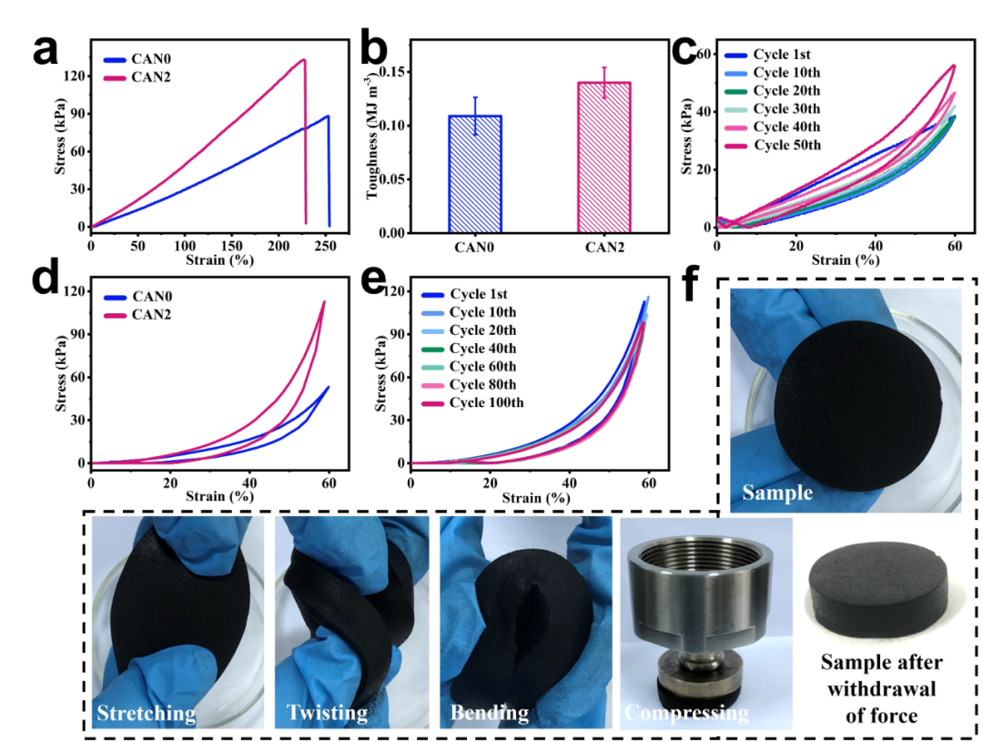图3:CAN0和CAN2水凝胶: (a-b) 拉伸的应力-应变曲线和韧性。 (c) CAN2水凝胶60%应变下的拉伸循环的应力-应变曲线。 (d) CAN0和CAN2水凝胶的压缩的应力-应变曲线。 (e) CAN2的压缩循环的应力-应变曲线。 (f) 样品图片,样品弯曲,拉伸,扭曲,压缩图片和撤去应力后的样品图片。