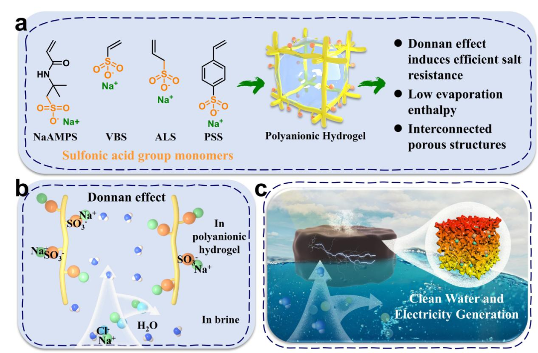 图1:(a)阴离子水凝胶的成分和优势。(b)唐南效应诱导的耐盐机理。(c)水凝胶净水和发电的示意图。