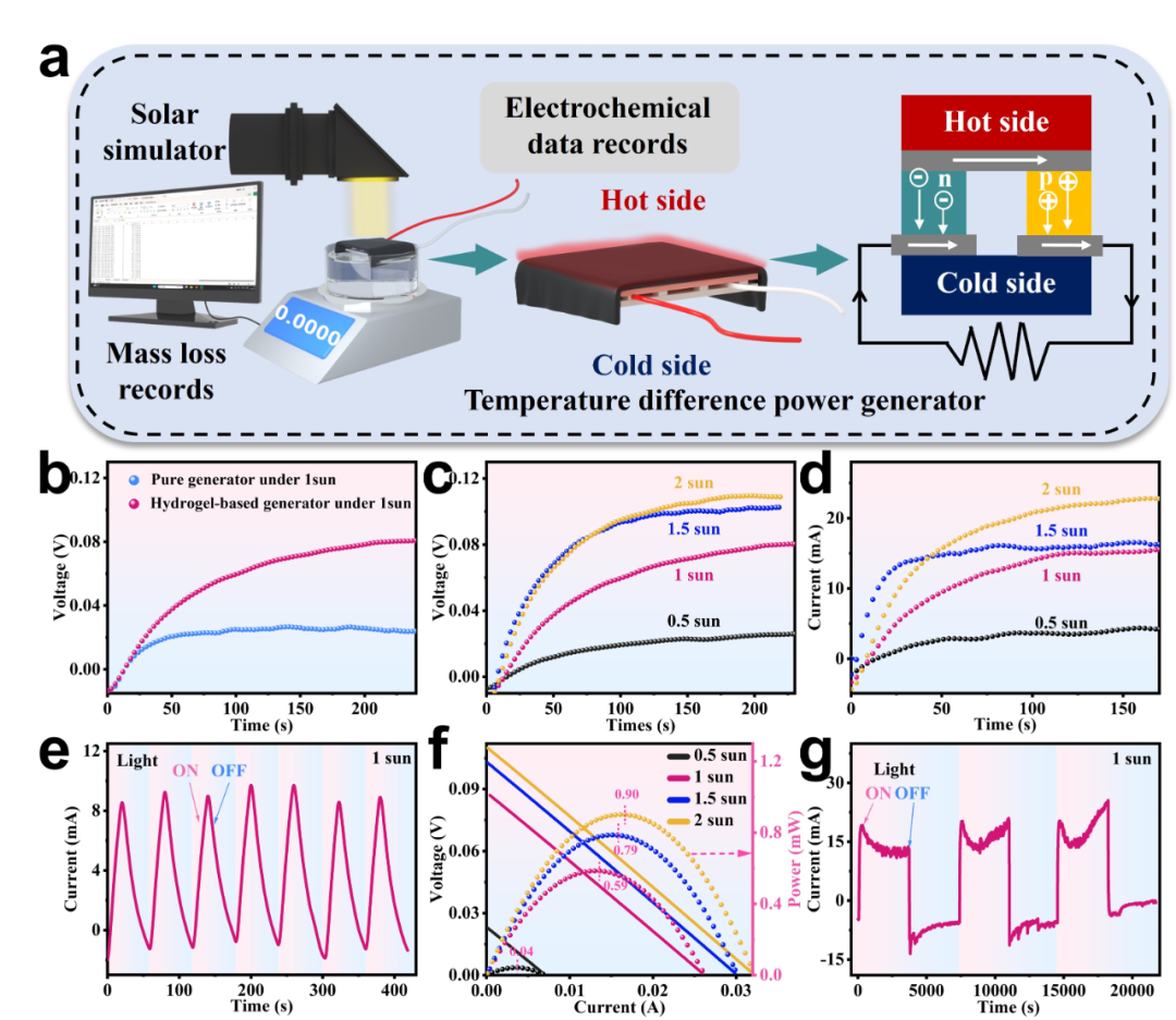 图8:(a)热电联产装置示意图与温差发电原理示意图。(b)Voc的变化。(c)不同光照条件时Voc。(d)不同光照条件的Isc。(e)1太阳光照时Isc。(f)不同光照条件下的功率和功率密度。(g)CAN2水凝胶在1太阳光照时Isc。