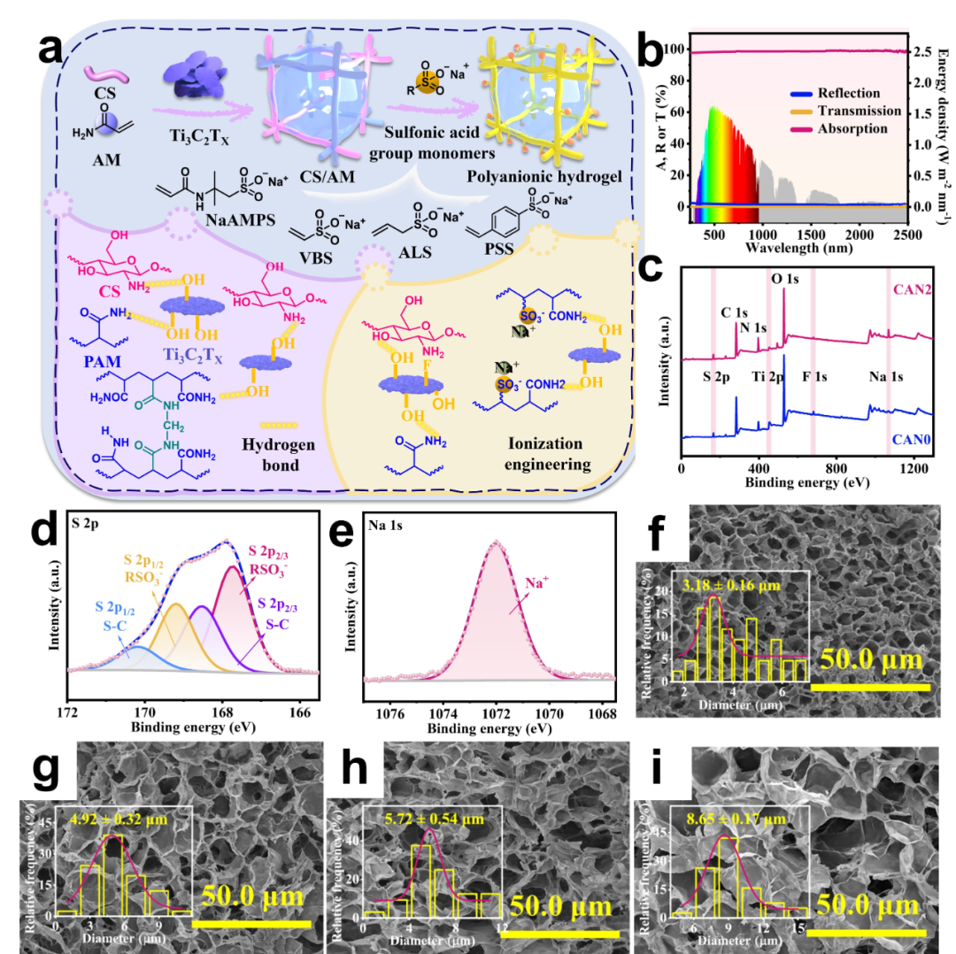 图2:(a)负电性水凝胶的制备过程。(b) CAN2的吸收光谱。(c)CAN0和CAN2的XPS图。CAN2的XPS图: (d) S 2p,(e) Na 1s。(f-i)CAN0,CAN1,CAN2和CAN3的SEM图。