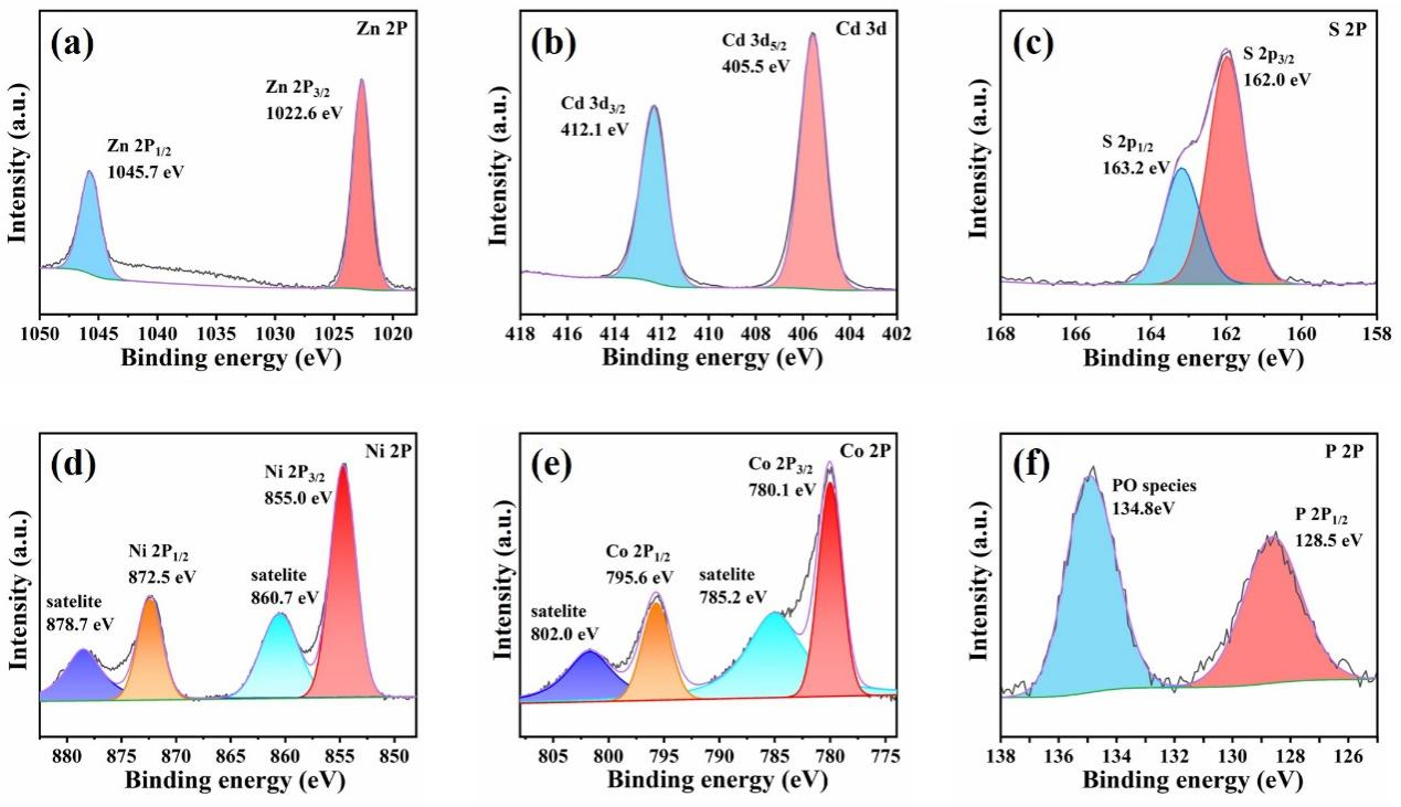 图2. ZnCdS-8%NiCoP复合材料的高分辨XPS光谱(a) Zn 2p, (b) Cd 3d, (c) S 2p,(d) Ni 2p, (e) Co 2p, (f) P 2p。