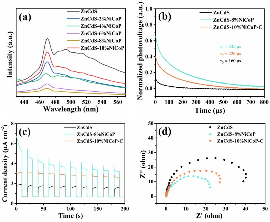 图3. (a) ZnCdS和ZnCdS-x%NiCoP的UV-vis DRS图,(b) ZnCdS的能带结构,(c) ZnCdS和ZnCdS-8%NiCoP的带隙图,(d) ZnCdS的M-S图。
