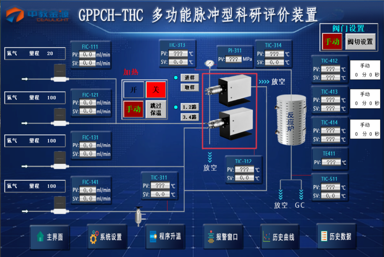 本装置的自动控制集成在工控一体机上,包括压力监测、报警界限参数设置、气体体积流量自动控制、程序升温自动控制、六通阀及脉冲进料方式自动切换、数据实时监测和记录等。在管路切换和排放以及出设置手动阀门及安全阀,实现手动控制与自动控制结合,保证装置合理性和可操作性。
