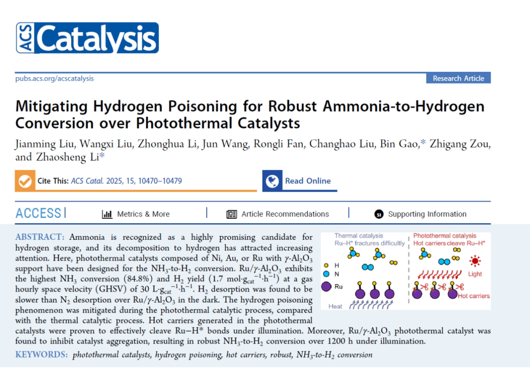 首次揭示热载流子在氨分解中对Ru-H*键的定向调控作用,为氢中毒问题提供了新解决方案。