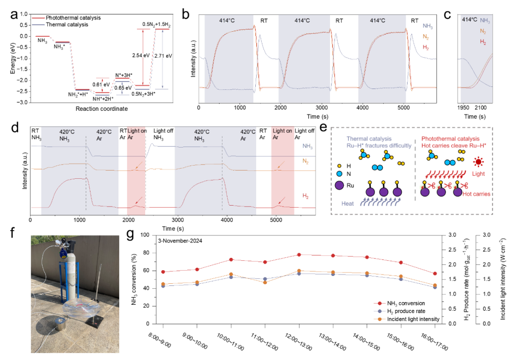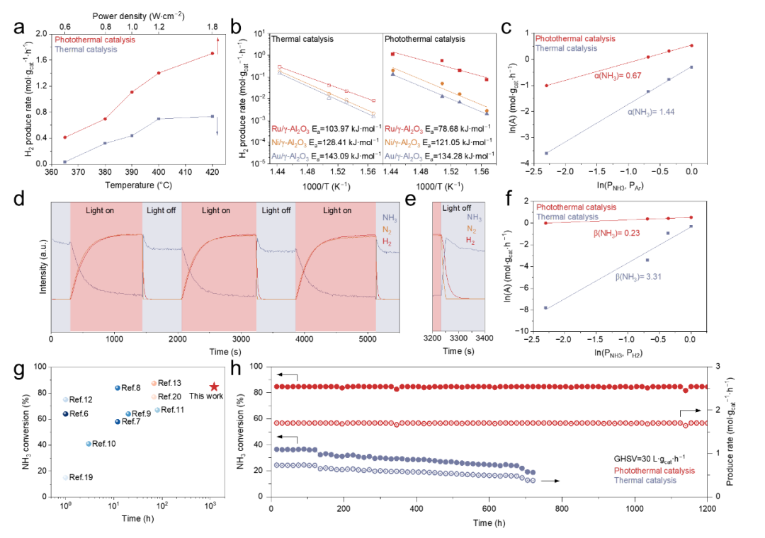 理论计算表明,光热催化将NH₃分解的表观活化能从热催化的2.71 eV降至2.54 eV(图4a)。