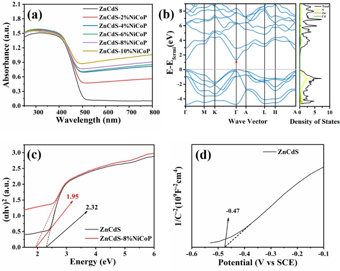 图3. (a) ZnCdS和ZnCdS-x%NiCoP的UV-vis DRS图,(b) ZnCdS的能带结构,(c) ZnCdS和ZnCdS-8%NiCoP的带隙图,(d) ZnCdS的M-S图。