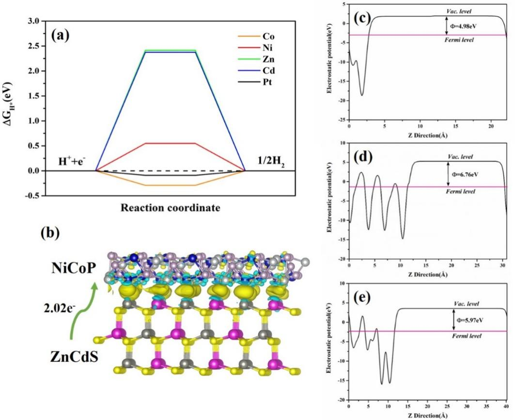 图6. (a) HER的自由能图,(b) ZnCdS-NiCoP的电荷密度差,(c) NiCoP, (d) ZnCdS, (e) ZnCdS-NiCoP沿c方向的功函数。
