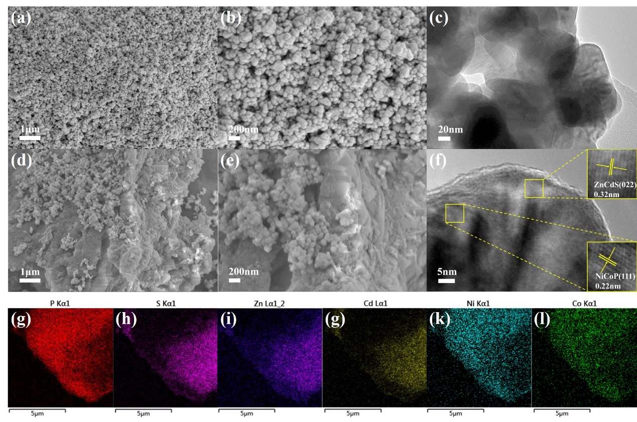 图1. (a-b) ZnCdS和(d-e) ZnCdS-8% NiCoP的SEM图像;(c, f) ZnCdS-8%NiCoP的TEM图像和(g-l) EDS图像。
