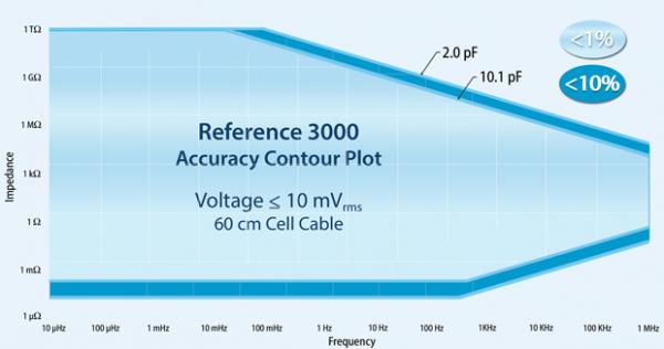 精度等值线图将详细展示在实际操作中可实现的各种仪器性能。 此结果包括电化学池电缆。